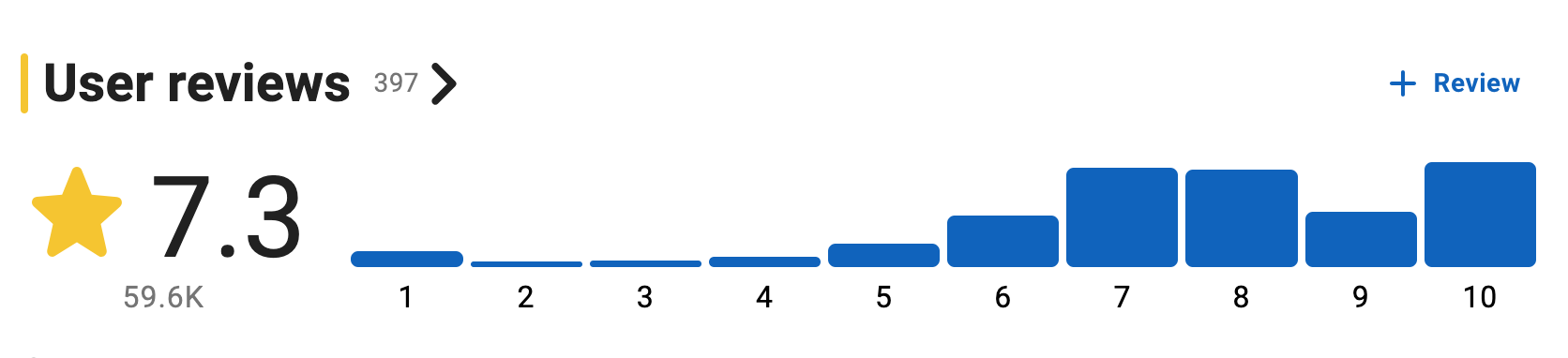 Fordeling av hvor mange stjerner serien er blitt gitt på IMDB. Skjermbilde tatt den 17. september 2025.