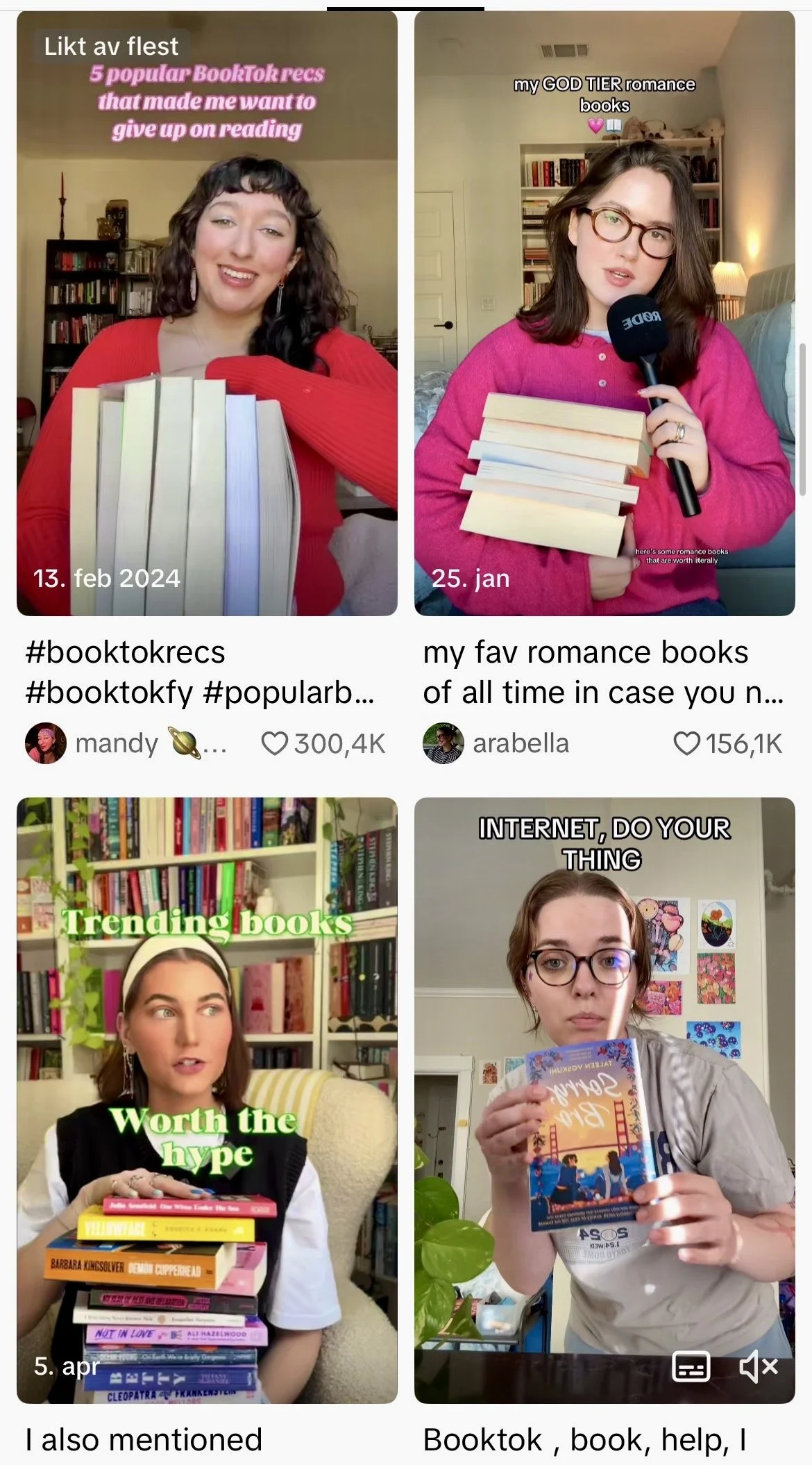 Noen av oss kjenner allerede begrepet BookTok, og har kanskje latt seg inspirere til å kjøpe et par bøker. Hos Norli kunne jeg høre at de har flere unge, spesielt jenter, som kommer inn og etterspør bøker som de har blir tipset om gjennom et bokunivers på den sosiale medieplattformen TikTok.