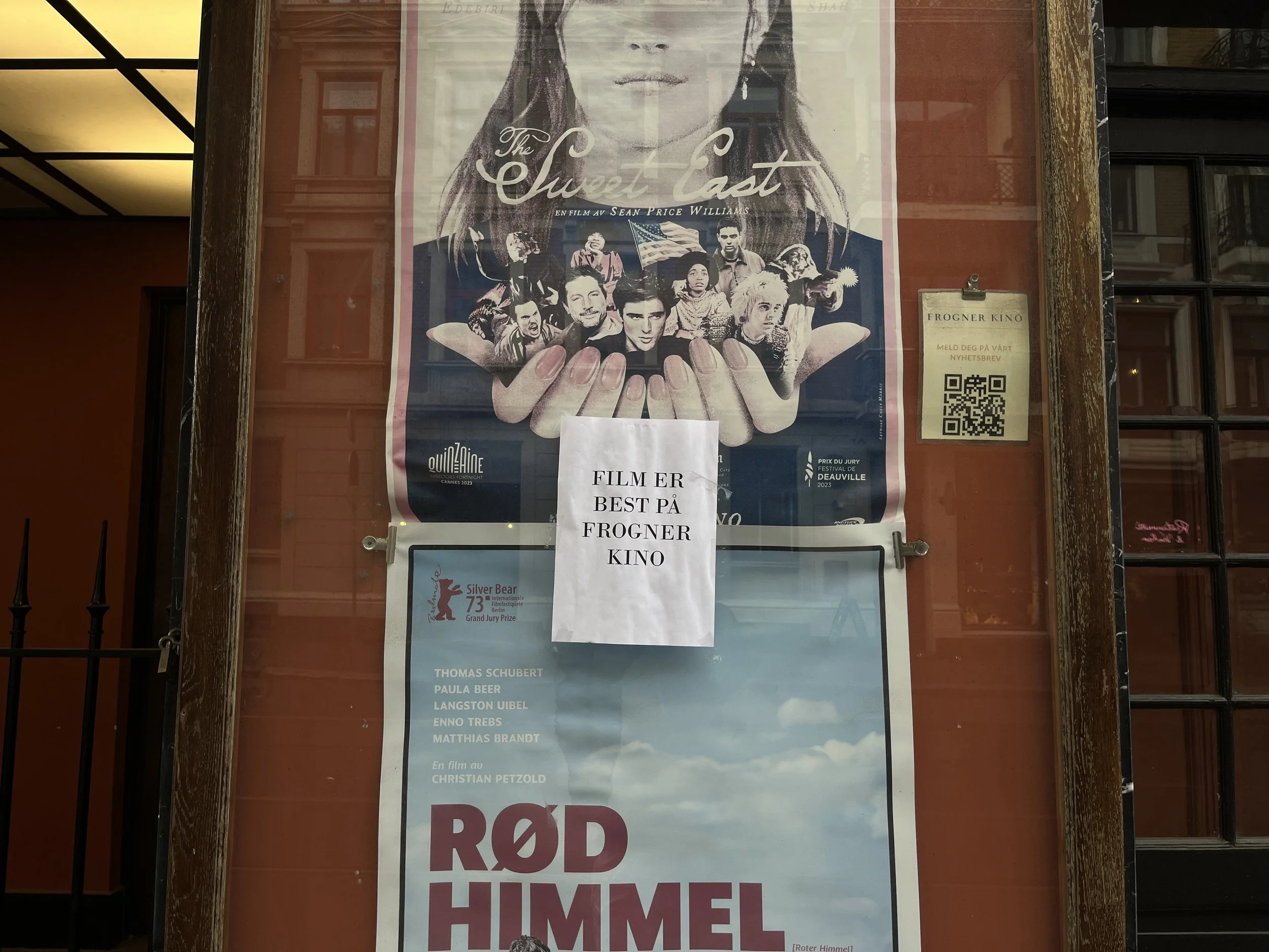 Sommeren 2024 henges en lapp på døren til vernede Frogner kino. “Sommerstengt inntil videre” var budskapet, og til tross for flere årstidskifter forble lappen hengende og dørene stengt. Solblekede plakater fra nettopp den sommeren pryder fortsatt inngangspartiet, men nå har de fått et tilskudd. Et A4 ark med ordene “Film er best på Frogner kino” er demonstrativt teipet over de utdaterte filmplakatene.